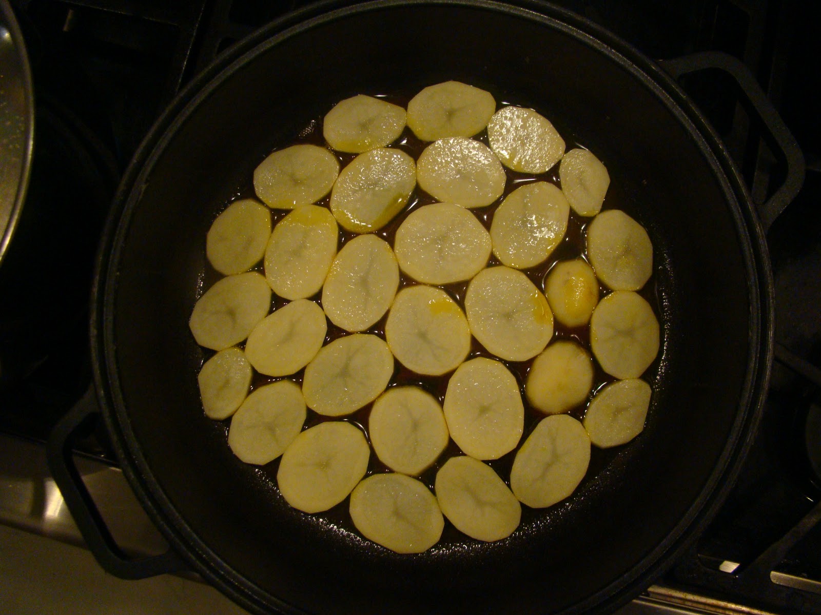3. מניחים את תפוחי האדמה על השמן לכיסוי מלא של תחתית הסיר. ממליחים.
