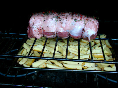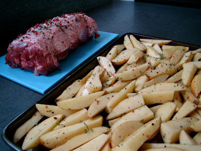4. כשהתנור חם, מניחים את תבנית תפוחי אדמה על המגש התחתון וקומה מעליו מניחים את נתח הבשר (כך ששומן הבשר יטפטף על תפוחי האדמה... יאמי).