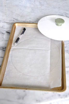 1.מחממים תנור ל150 מעלות. מכסים תבניות בנייר אפייה ומסמנים בעזרת עט 3 עיגולים בגודל צלחת ההגשה. בערך 22 ס"מ כל עיגול. הופכים את הדפים בכדי שסימני העט לא יעברו לביסקויטים.