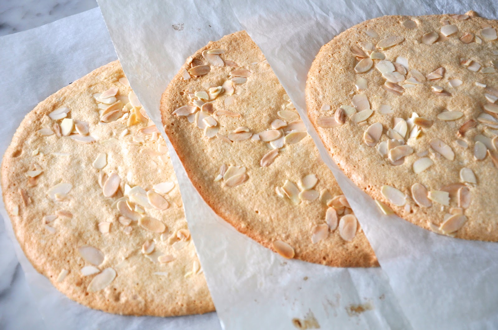3. מערבבים את האבקת סוכר עם הקמח שקדים והקורנפלור ומקפלים בעדינות לתוך קצף הביצים. מעבירים בעזרת כף את הבלילה לניירות האפייה כך שיכסו את שטח העיגול המסומן. מפזרים את השקדים הפרוסים מעל כל עיגול ומכניסים לתנור.