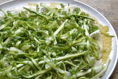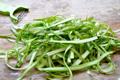 4. בינתיים... בעזרת קולפן "מקלפים" את האספרגוס לפרוסות דקיקות. מצמידים את האספגרגוס לקרש חיתוך, אוחזים בשליש התחתון, (הלא אכיל ממילא) ומגלחים לאורכו של האספרגוס. אני גילחתי פעמיים ואז סובבתי וכך המשכתי בסיבובים. את השליש התחתון משליכים. מעבירים את האספרגוס לקערה, מפזרים מעל את השמן זית, המלח והפלפל. מערבבים.