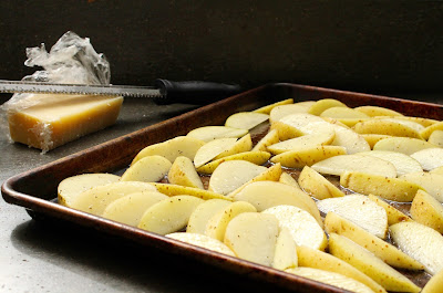 2. חוצים כל תפוח אדמה לאורכו. כל חצי פורסים ל2-4 פלחים, תלוי בגודל התפוח אדמה. מערבבים את תפוחי האדמה עם השמן זית, המלח, הפלפל, השמן וכף אחת משמן הכמהין. מסדרים על תבנית אפייה, מנסיון עדיף מרופדת עם נייר אפייה. מכניסים לתנור לכ20 דקות או עד שהתחתית משחימה והופכים לעוד כרבע שעה. מוציאים מהתנור, מוסיפים את הכף הנוספת של השמן כמהין, הפטרוזיליה והפרמזן ומערבבים. מגישים מייד.