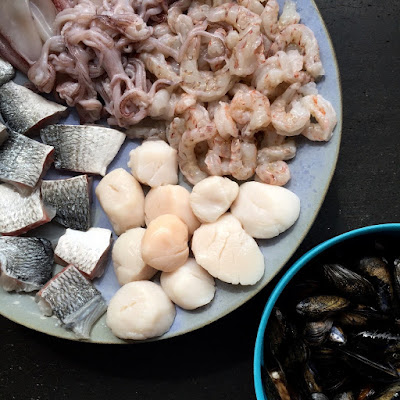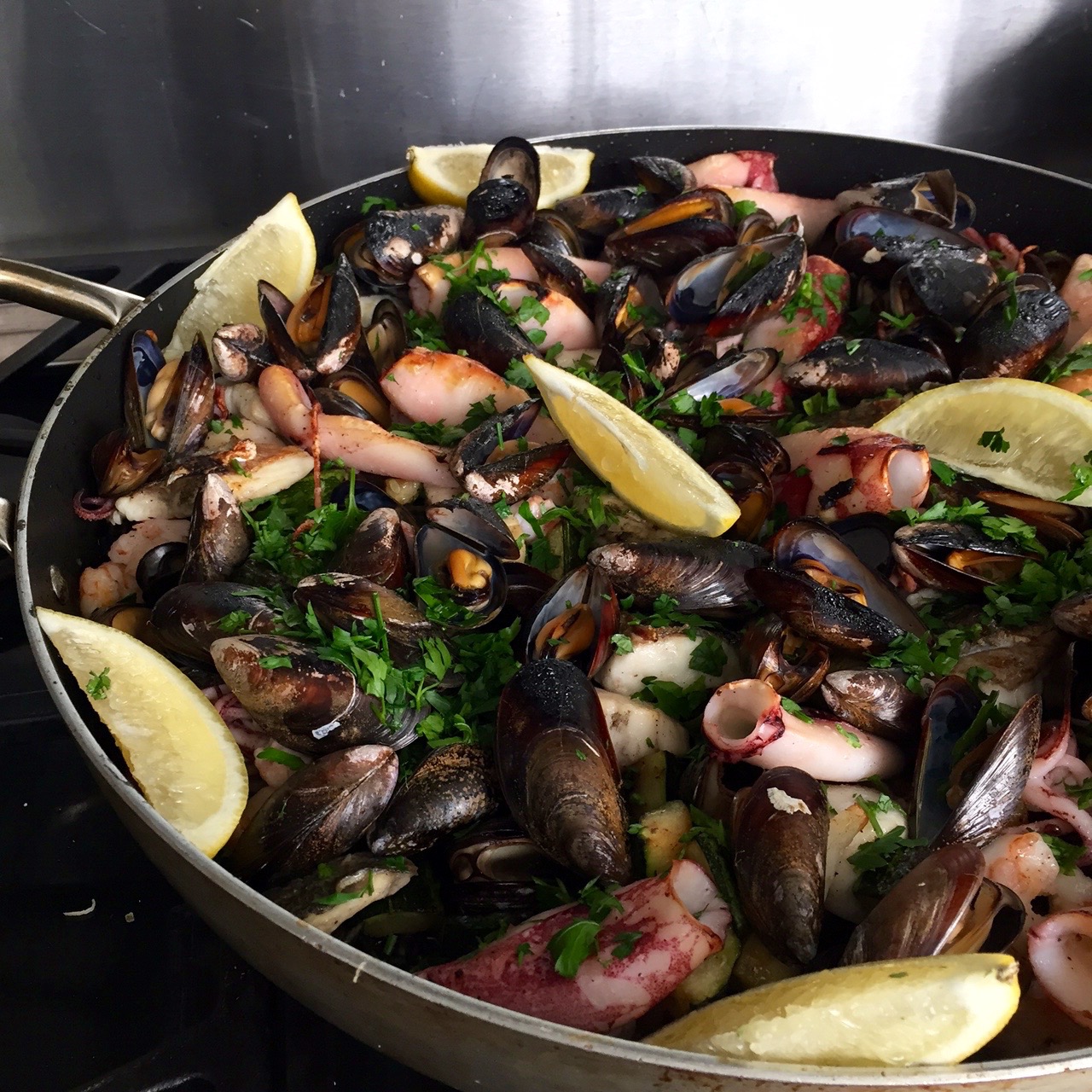 4. כשהאורז רך דיו, מסדרים את הדגים והפירות ים בצפיפות מעל האורז ומכניסים לתנור לדקות ספורות. אחרי כ7 דקות הוצאת קלאמרי אחד וטעמתי לוודא שמוכן. מוציאים מהתנור, מפזרים את הפטרוזיליה, ואת הפלחי לימון ומגישים לשולחן בגאווה גדולה.