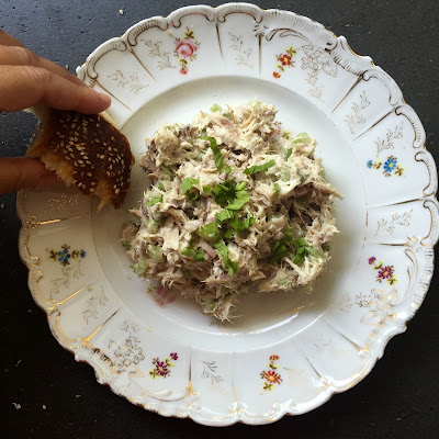 2. מסירים את העור מהפילטים ומסירים עם יש את העצמות הקטנות שבשולי הפילה. מפרקים בעזרת מזלג או בעזרת האצבעות - כמוני, ישר לתוך הקערה עם הרוטב, מערבבים בעזרת מזלג. טועמים ומוסיפים מלח. מעבירים לצלחת הגשה.